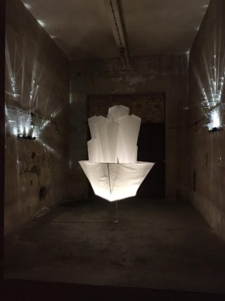 Das größte Kunstwerk eilte aus logistischen Gegebenheiten erst am Vortag zum Festivalort. Ein großer LKW transportierte die Rauminstallation „Jene die aus dem Süden kamen“ von Thomas Bartel zum E-Werk. Langsam öffnete sich die Ladeluke und es offenbarte sich uns ein an ein Schiffsrumpf anmutendes, feingliedriges und lichtes Objekt. Bei frischem Gegenwind wurde nach einer schlanken Wendung um den Bug der Schiffskörper samt Aufbauten pfeilgerade über eine Rampe in die Halle manövriert. Damit hatten wir das Kunstwerk im Hafen und es konnte vor Anker gehen.