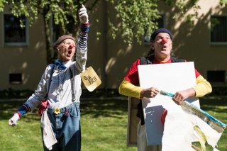 Clowntheater mit viel liebe zur Sonne, die erst noch gemalt werden muss. Mit kleinem Scheitern und großem Stolpern, zum rückwärts schauen, weil der Schmetterling nicht so will wie er soll – fliegen. Und mit viel Unfug, im, auf und unter dem Kopf. Tröt!