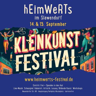 Heute ist der Tag, auf den wir die letzten 10 Monate hin gefiebert haben: Wir begrüßen Euch herzlich zum 12. hEimWeRTs-Kleinkunstfestival 2024. Euch erwartet ein buntes Programm auf dem gesamten Slawendorf-Gelände: Live-Musik auf 2 Bühnen, Kabarett, Kleinkunst und Theater. Workshops in den Bereichen Tanz, Hip Hop, Meditation, Yoga und vieles mehr. Kreativ-Angebote und Gemeinschaftsaktionen für Klein & Groß, Lesung, Radio und fahrradbetriebene Ökotrainer. Lichtinstallation und Bildende Kunst könnt ihr ebenfalls entdecken.